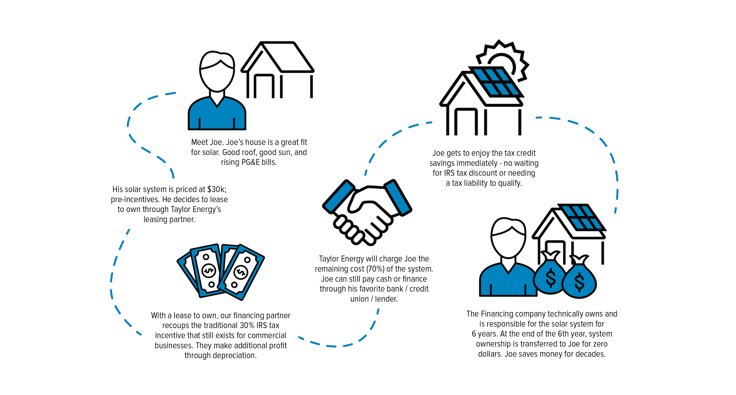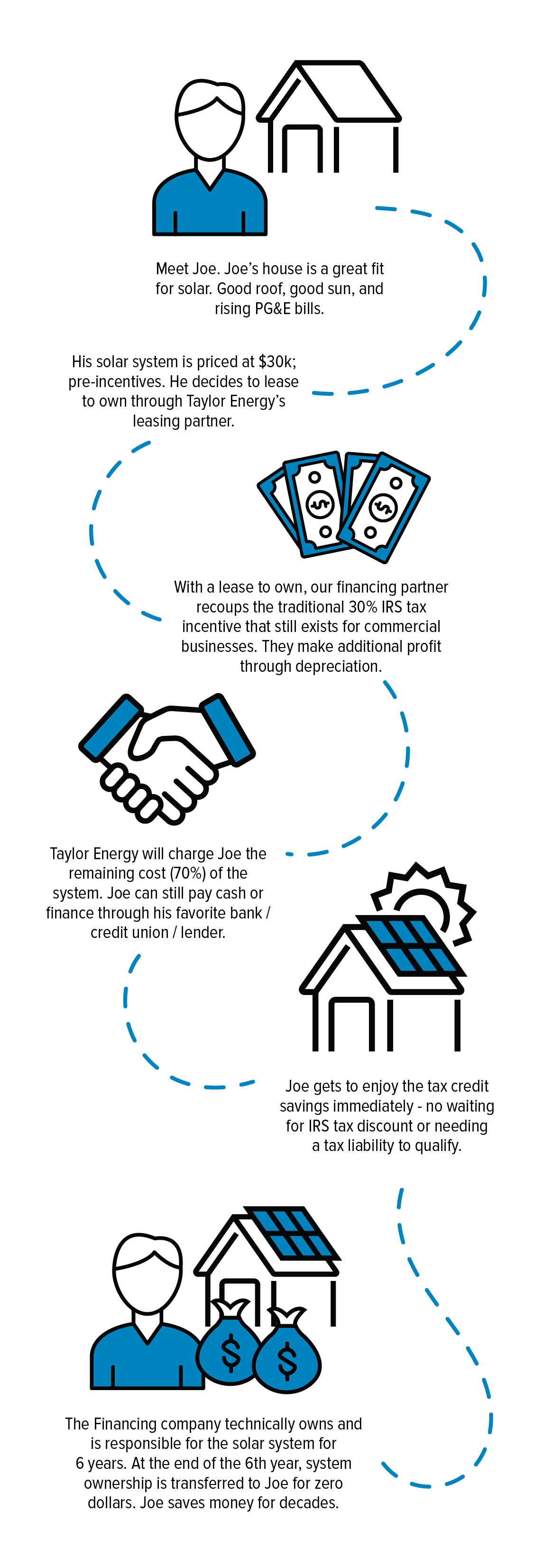 For example, instead of paying $100,000 and waiting a year or more to get $30,000 back, a homeowner might pay $73,000 – $75,000 up front and receive the same functional benefit immediately. The financing company then owns and maintains the system for six years (the period during which they realize depreciation). After that, the customer can often take ownership for $0.